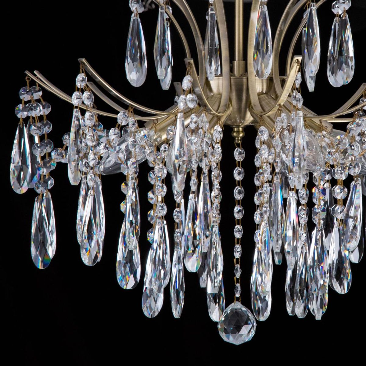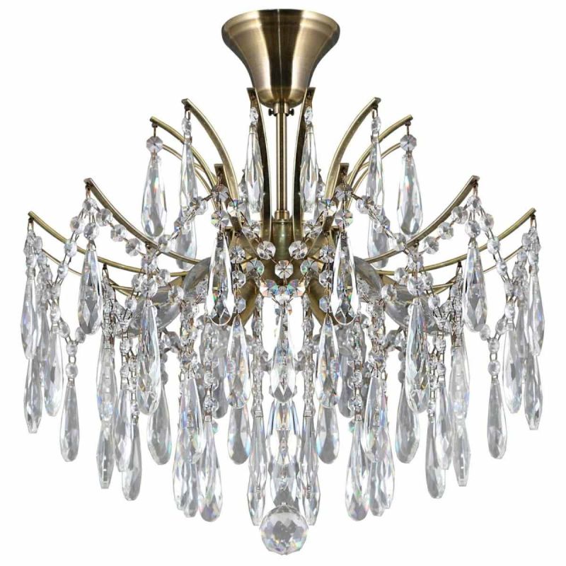 Модель уместна в гостиной и других жилых помещениях, где требуется общий свет с акцентом на материалы. Визуальный образ формируется за счет бронзовой арматуры и прозрачного хрусталя без лишних деталей.