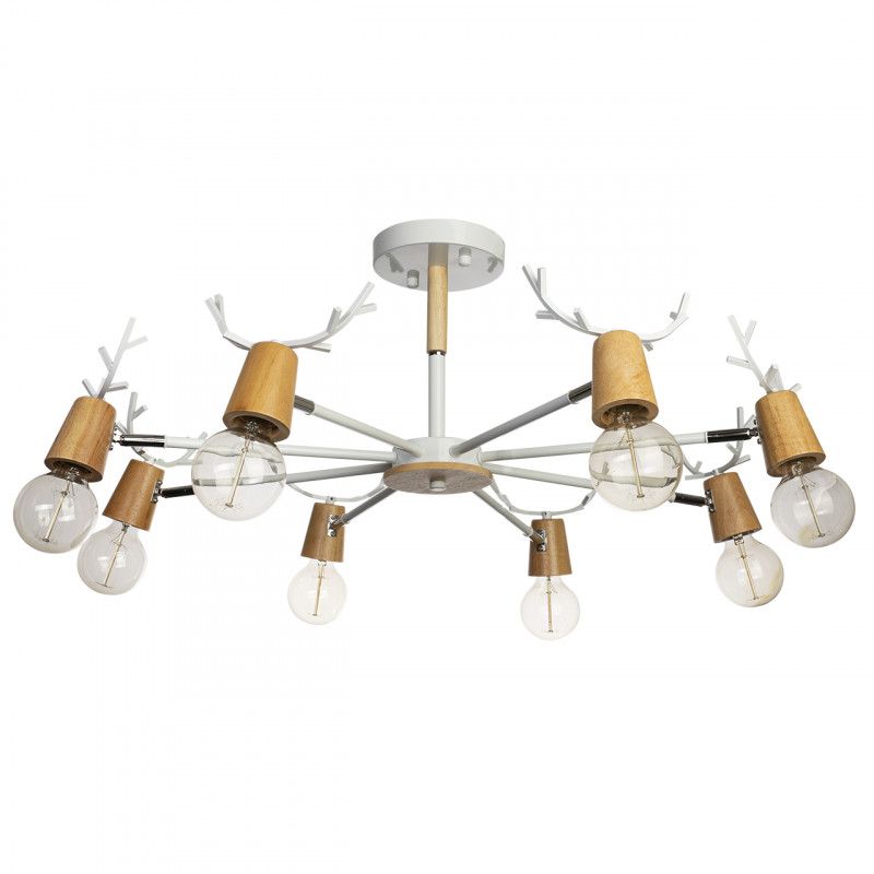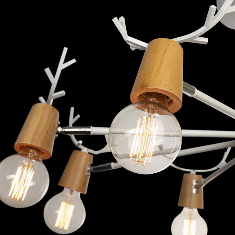 Восемь патронов E27 на поворотных держателях помогают направить потоки света, площадь освещения до 32 кв. м. При использовании ламп накаливания мощностью до 40 Вт суммарная нагрузка 320 Вт, питание 220 В. Плафоны не предусмотрены, источник света открыт, металл арматуры окрашен в белый цвет.