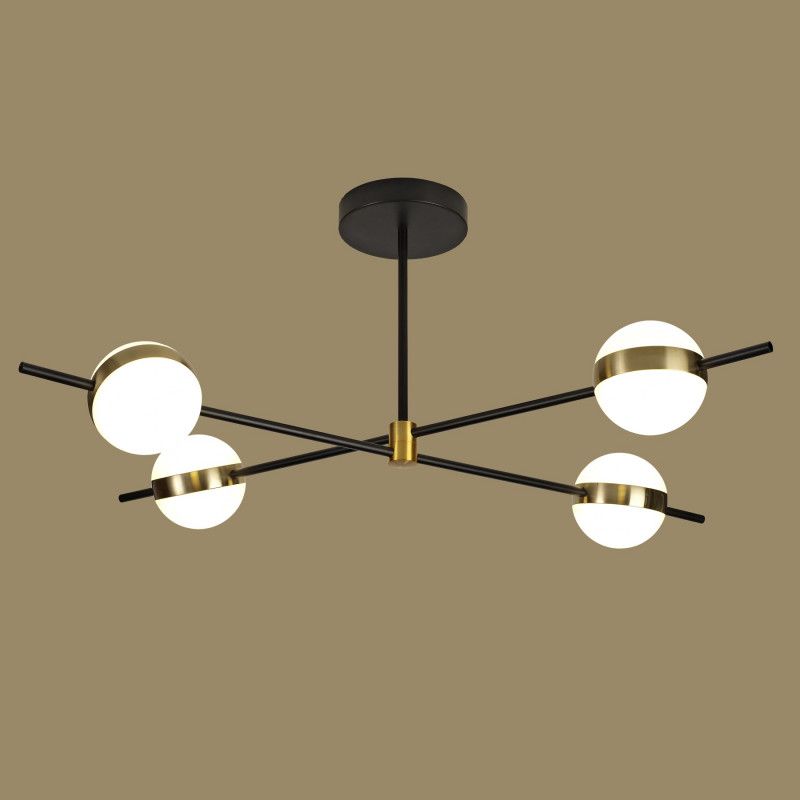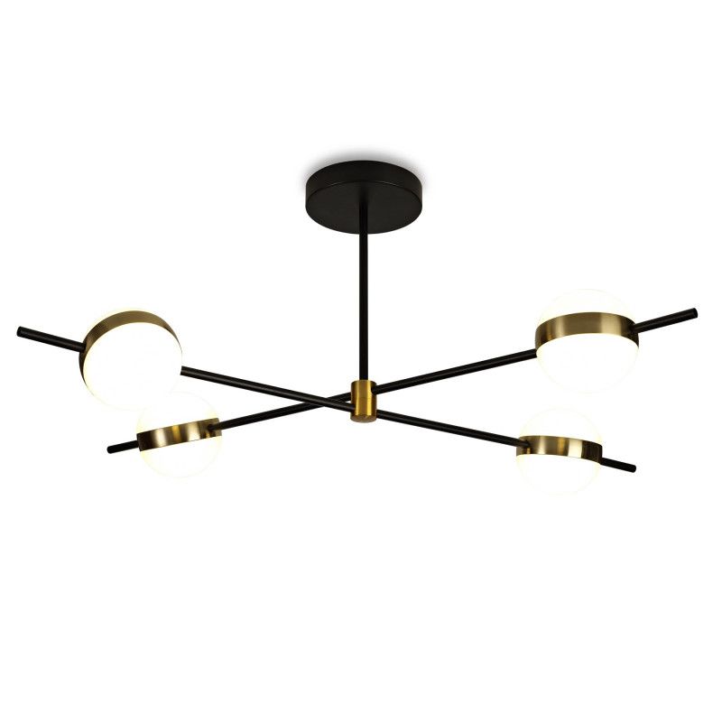 Четыре круглых белых плафона из акрила на черной металлической арматуре образуют выразительную композицию диаметром 90 см и высотой 35 см. Плафоны направлены вниз, свет теплый 3000 К, мягкий и уютный.