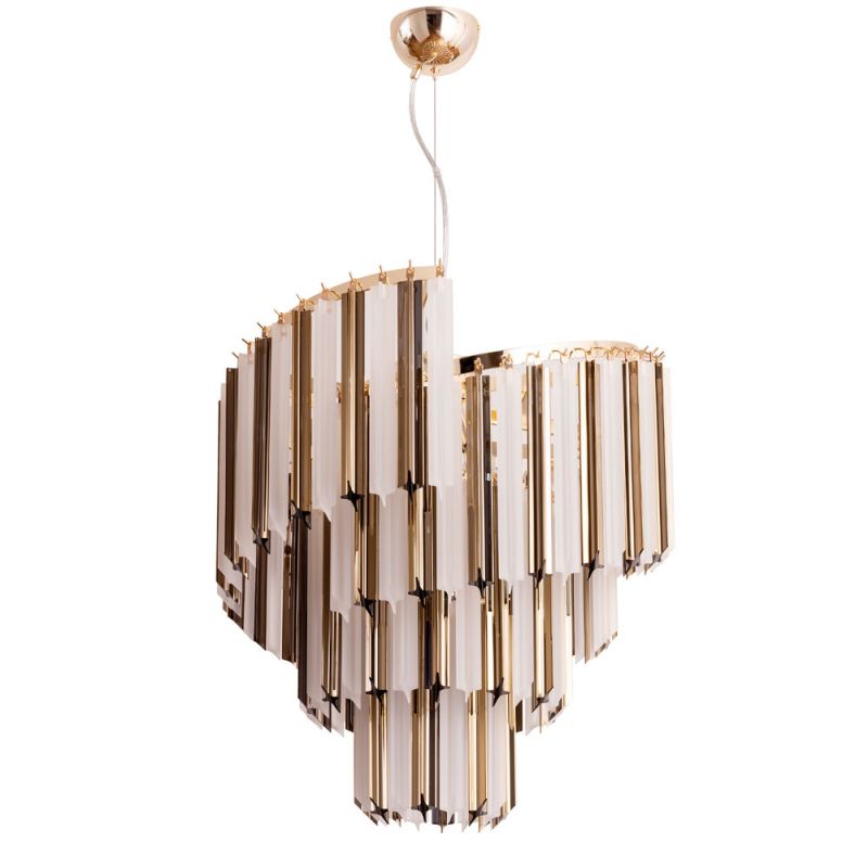 Материалы подобраны для долгой службы и выразительного света: металл с золотистым покрытием и хрусталь высокого качества. Напряжение питания 230 В. Один декоративный плафон объединяет группу ламп, создавая цельный световой образ.