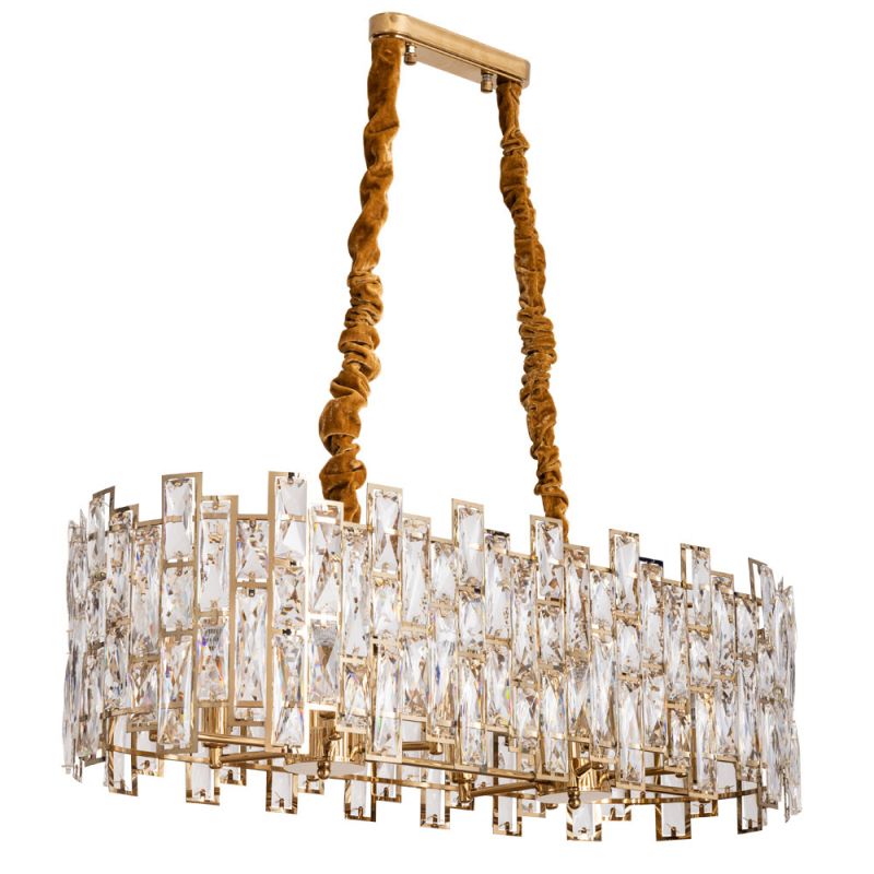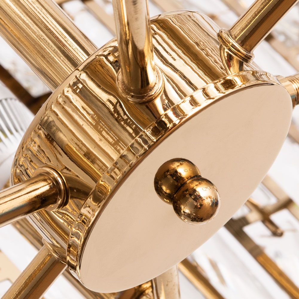Габариты помогают точно спланировать размещение: длина 860 мм, ширина 340 мм, высота 270 мм. Прозрачный хрусталь визуально облегчает композицию, а теплое золото арматуры поддерживает стиль модерн. Форма плафона - цилиндр.