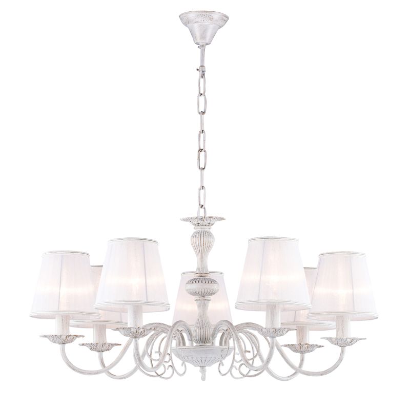 Подвесная люстра Favourite Malta 1730-7P создана для уютных интерьеров в стиле прованс. Белая металлическая арматура и семь конусных тканевых абажуров формируют мягкий, неглазящий свет и легкий, воздушный образ. Абажуры направлены вверх, акцентируя объем комнаты без жестких теней.