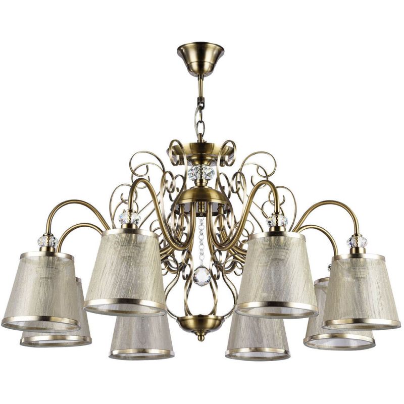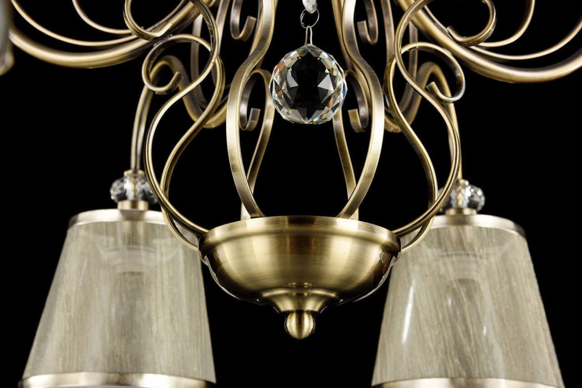Подвесная люстра Freya Driana FR2405-PL-08-BZ встречает мягким теплым сиянием. Восемь конусных абажуров из бежевой ткани направлены вниз, формируя уютные островки света и эффект аккуратной камерности. Тканевые абажуры приглушают блики, оставляя предметы объемными и естественными. Бронзовая арматура из металла добавляет интерьеру благородный оттенок, подчеркнутый спокойной геометрией арт-деко.