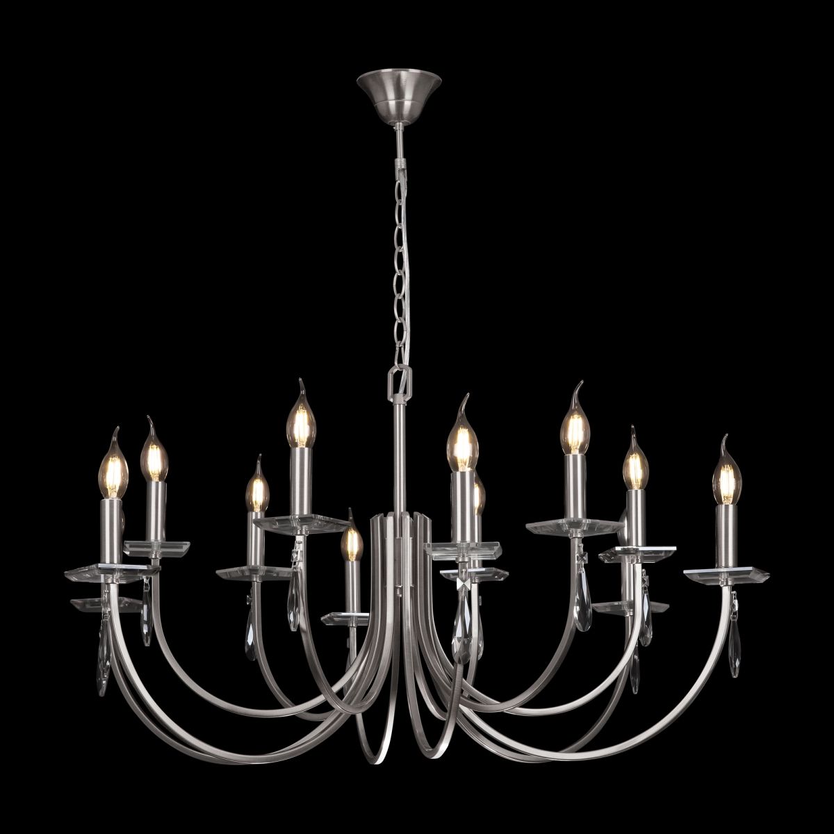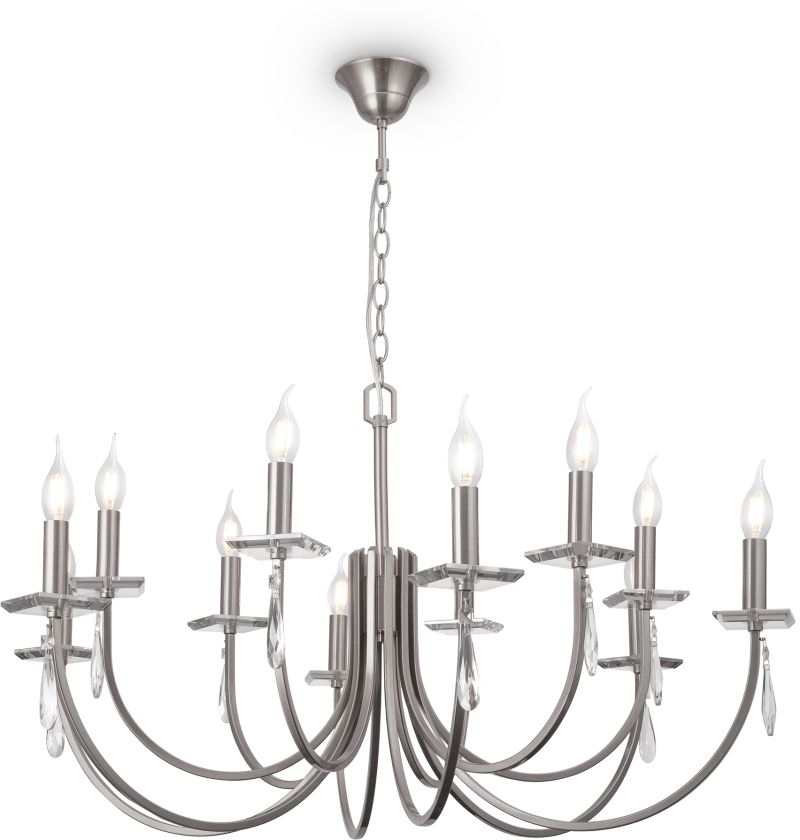 Модель рассчитана на двенадцать ламп накаливания с цоколем E14 по 40 Вт. Суммарная мощность 480 Вт легко перекрывает площадь до 24 м², так что гостиная, столовая или просторный холл получат ровное общее освещение. Питание стандартное 220 В, степень защиты IP20 соответствует бытовым помещениям.