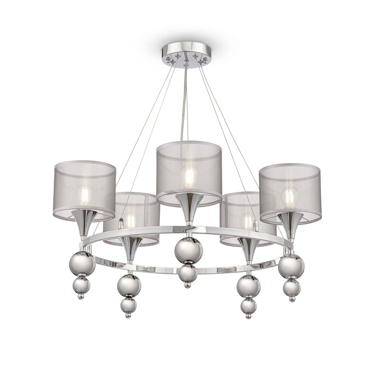 Подвесная люстра Freya Lauren FR5093PL-05CH создаёт спокойное, ровное освещение для гостиной. Пять цилиндрических абажуров из ткани мягкого серебряного оттенка направлены вверх, свет отражается от потолка и наполняет пространство мягкими полутенями. Хромированная арматура подчеркивает современный характер модели, линии аккуратные и легкие.