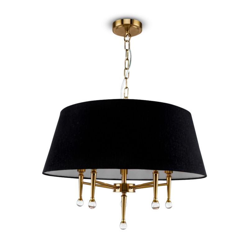 Крупный конусный абажур из плотной ткани черного цвета формирует мягкий, комфортный свет, а арматура цвета золото добавляет теплый акцент. Пять ламп накаливания E14 по 40 Вт дают суммарно до 200 Вт света, этого достаточно для комнаты до 10 м². Направление света вниз подходит для зоны гостиной или обеденного стола.