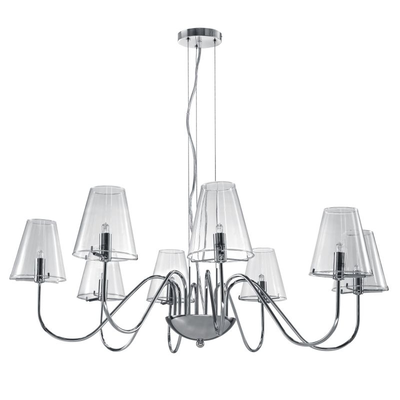 Восемь плафонов направляют поток к потолку, возникает мягкое отражение без резких контуров. Диаметр 800 мм формирует уверенный, но ненавязчивый акцент в гостиной, где важно ощущение воздуха и порядка. Гладкие поверхности стекла и металла остаются актуальными среди современных фактур дерева, бетона и текстиля. Прозрачное стекло без оттенка сохраняет естественные краски интерьера, а хром арматуры дает чистый, прохладный отблеск. Восемь конусных плафонов выстраиваются в равномерный круг и поддерживают симметрию пространства.