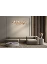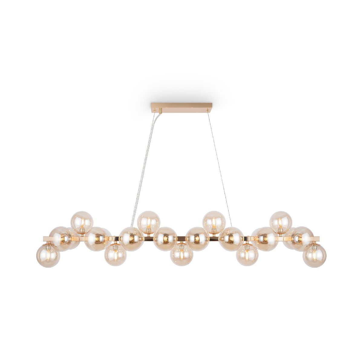 Подвесная люстра Maytoni Dallas MOD547PL-25G создана для парадных пространств и больших гостиных. Линейный корпус длиной 1235 мм и шириной 230 мм образует выразительную световую линию, высота всего 228 мм удобна при стандартных потолках. Янтарные стеклянные элементы формируют теплый, благородный оттенок света, а золотая металлическая арматура подчеркивает современный характер коллекции Dallas Gold.