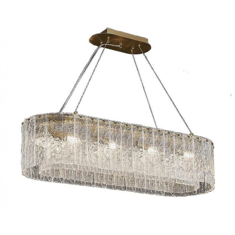 Овальный хрустальный абажур длиной 900 мм формирует ровный поток света вниз. Прозрачные грани играют на отражениях, а золотистая металлическая арматура добавляет ощущение статуса и тепла. Компактная высота 240 мм удобна для помещений со стандартными потолками и для натяжных конструкций.