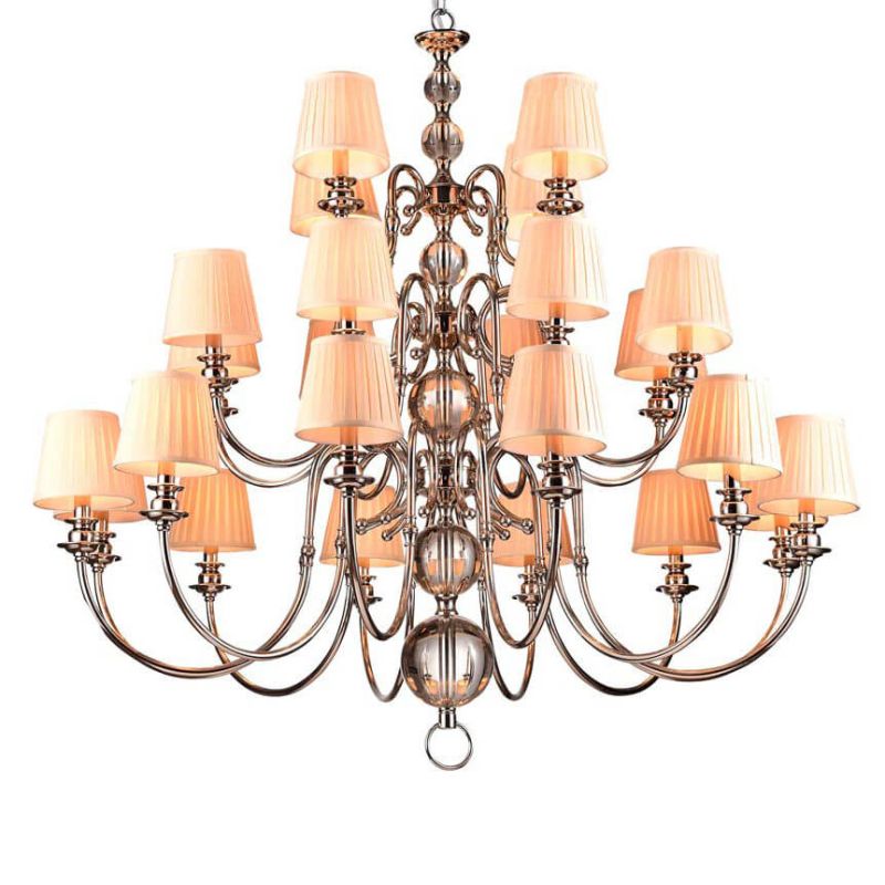 Диаметр 1300 мм и высота 1200 мм подчеркивают масштаб, многоярусная композиция с 24 источниками E14 создаёт глубокое, равномерное освещение. Используются лампы накаливания E14 до 60 Вт, напряжение 230 В. Люстра рассчитана на залы площадью до 80 м², гармонично раскрывает объем парадной гостиной, большого холла или пространства ресторана. Степень защиты IP20 - для сухих интерьеров. Конструкция совместима с натяжными потолками, монтаж потолочный, внешний вид остаётся лёгким даже при внушительном размере.