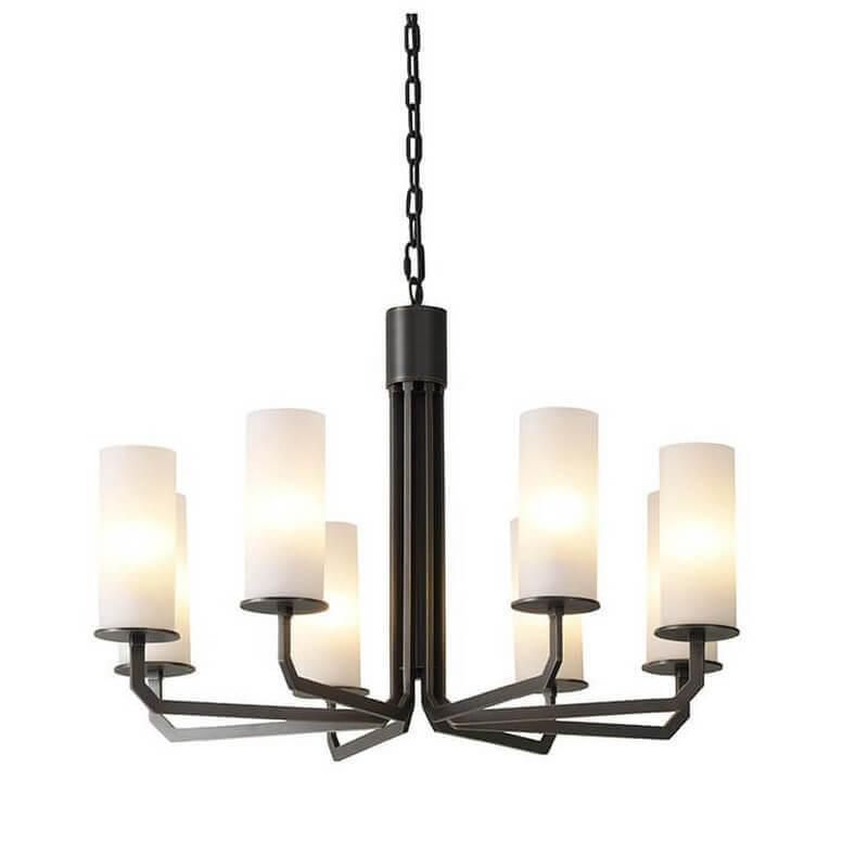 Стиль современный, форма плафона цилиндр, направление света вверх. В комплекте 8 плафонов и 8 посадочных мест под E14, применяется лампа накаливания. Потолочная группа освещения с IP20 рассчитана на сухие зоны, лучше всего в гостиной. Черная арматура и белое стекло дают ясный контраст и поддерживают спокойный интерьер. Установка проста, уход несложный, ресурс определяется типом ламп и частотой включений.