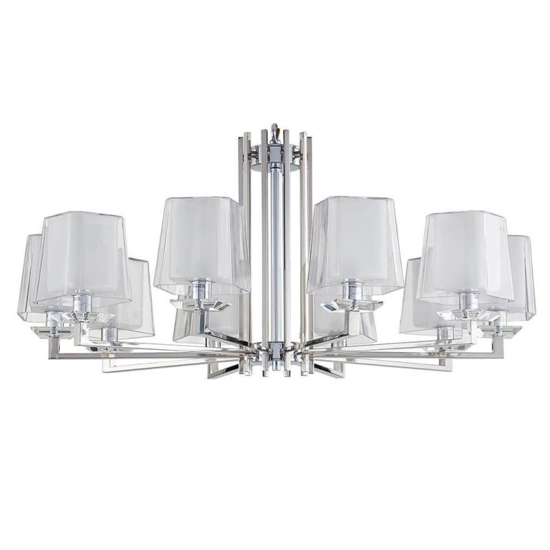 Десять плафонов из прозрачного стекла принимают лампы E14 до 60 Вт, суммарная мощность до 600 Вт при стандартном напряжении 220 В. Свет получается чистым и объемным, комфортным для бесед и неспешных встреч. Степень защиты IP20 подходит для сухих зон. Конструкция рассчитана на монтаж под натяжные потолки, подвес аккуратный и устойчивый.