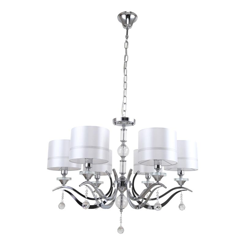 Здесь шесть белых тканевых абажуров цилиндрической формы направлены вверх. Свет отражается от потолка и мягко рассеивается по комнате — комфорт для глаз и ясная световая сцена, особенно актуально в спальне. Хромированная арматура из металла подчеркивает чистую геометрию и визуальную легкость.