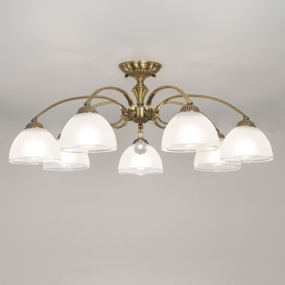 Потолочная люстра Citilux Франческа CL417173 наполняет гостиную мягким, ровным светом. Семь белых полукруглых плафонов из стекла направлены вниз, свет ложится на интерьер аккуратно и без бликов, создавая уютную атмосферу для разговора и отдыха. Бронзовая арматура подчеркивает классический характер модели и вносит благородное тепло в палитру комнаты.