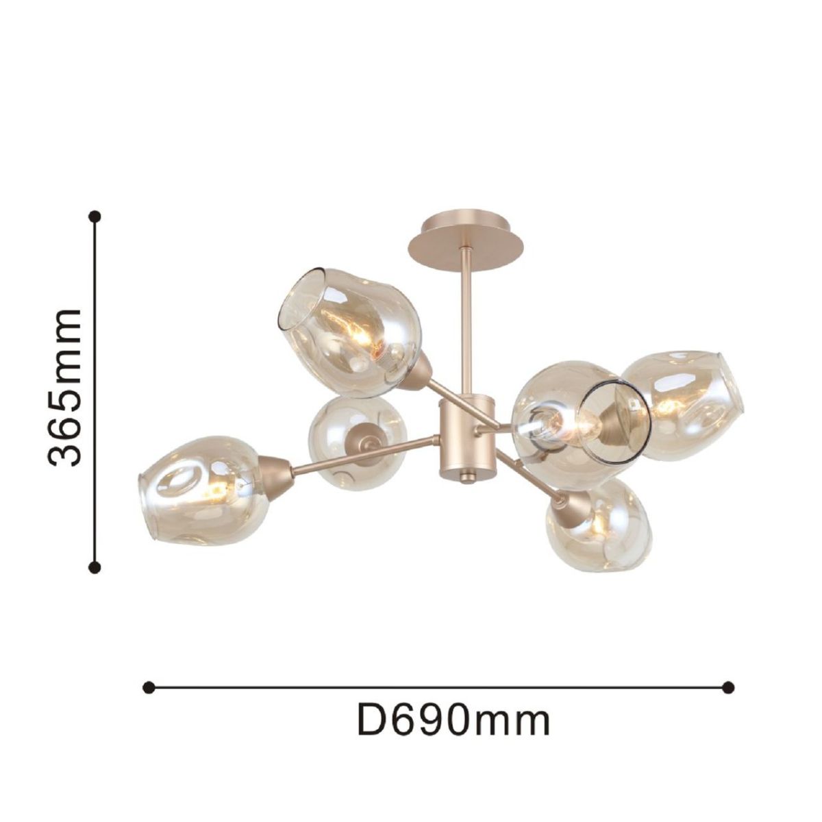 Шесть плафонов направлены в стороны, свет расходится равномерно и не слепит. Модель рассчитана на лампы накаливания с цоколем E14 по 40 W, суммарная мощность 240 W. Оптимально для комнат площадью до 12 м². Потолочное крепление и высота 365 мм помогают сохранить пространство, диаметр 690 мм формирует выразительный силуэт. Конструкция подходит для натяжных потолков при соблюдении стандартных требований установки.