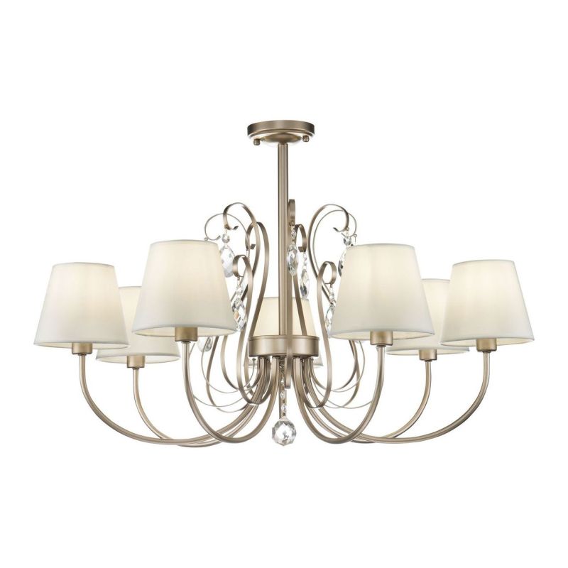 Потолочная люстра Freya Vanda FR2030CL-07G создаёт уютный вечерний сценарий для гостиной. Семь конусных абажуров из белой ткани направлены вверх, свет мягко рассеивается по потолку и стенам, оставляя внизу деликатные тени. Металлическая арматура цвета золото добавляет интерьеру благородный акцент и отсылает к геометрии ар-деко без излишней строгости.