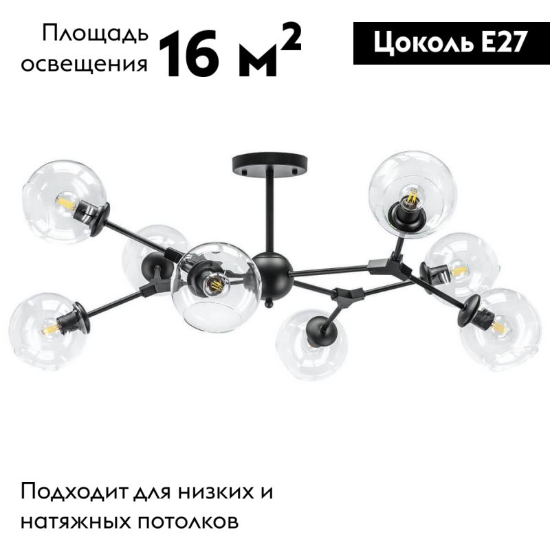 Потолочная люстра Lightstar Beta 785087, элегантная модель в стиле модерн для гостиной. Диаметр 1120 мм и восемь плафонов, направленных в стороны, формируют выразительное световое поле в комнатах до 16 м². Прозрачное стекло плафонов передает максимум света, а черная металлическая арматура создает графичный акцент.